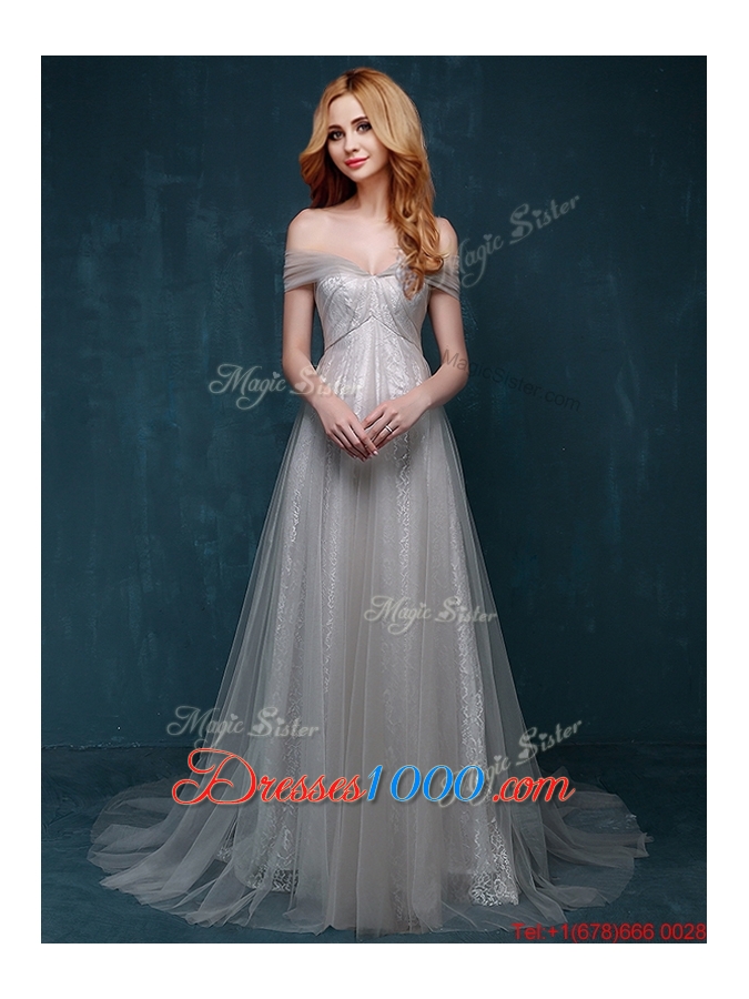 Sexy Off the Shoulder Brush Train Grey Evening Dress with Bowknot