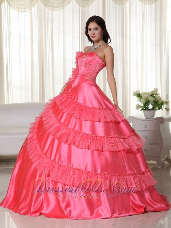 Embroidery Coral Red Floor-length Strapless Quinceanera Dress