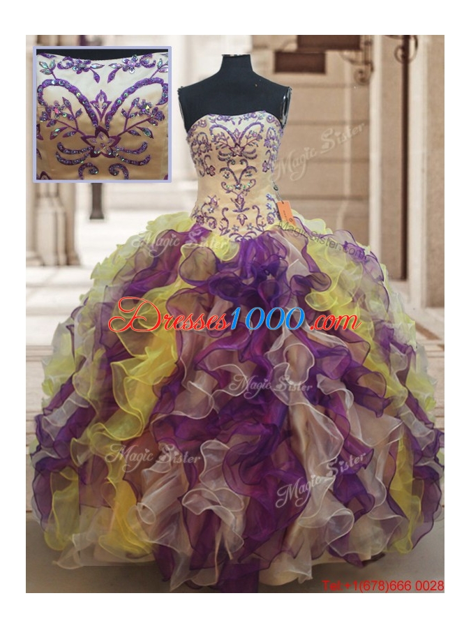 Popular Strapless Rainbow Colored Quinceanera Dress with Beading and Ruffles