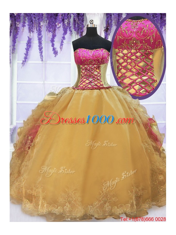 Laced Beaded and Ruffled Gold and Hot Pink Quinceanera Dress with Brush Train