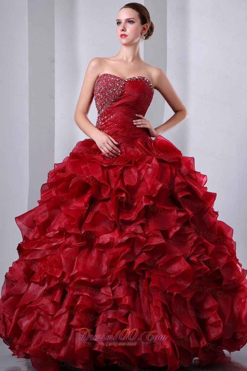 Wine Red Beading and Ruffles Quinceanea Dress A-Line Sweetheart