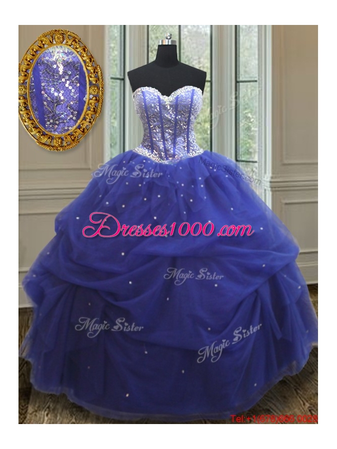 Lovely Beaded and Sequined Blue Quinceanera Dress in Tulle
