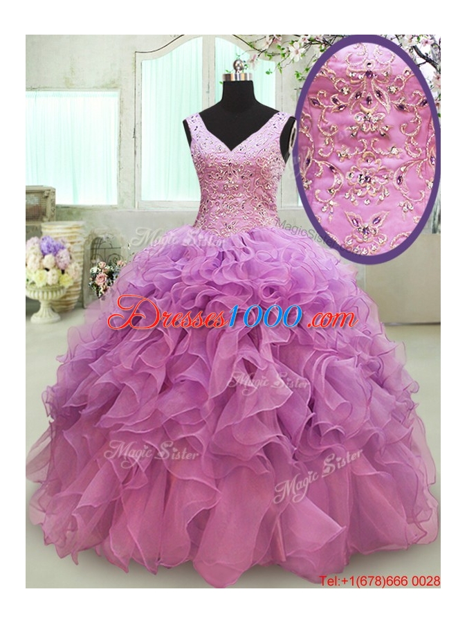Gorgeous Big Puffy V Neck Beaded and Ruffled Quinceanera Dress in Organza