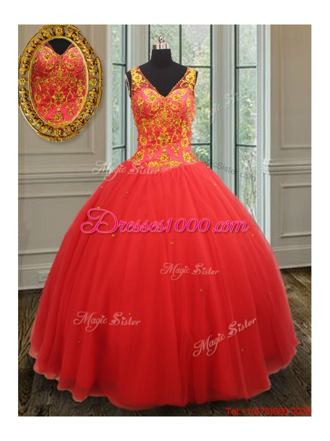 New Style Ball Gown V Neck Rust Red Sweet 16 Dress with Beaded Appliques