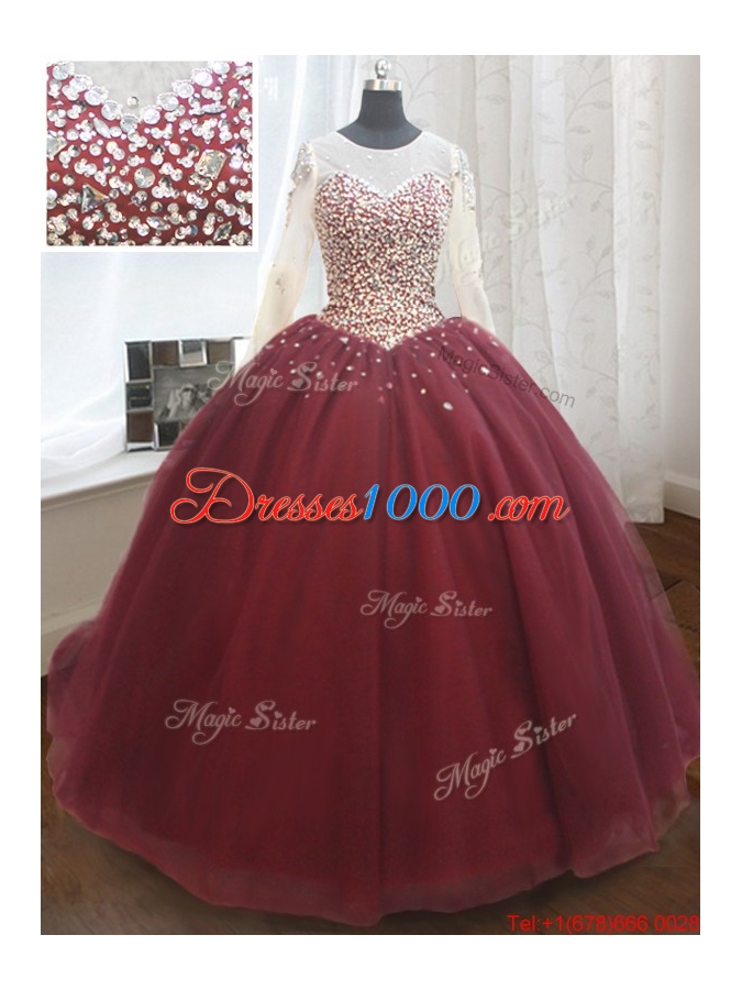 Elegant See Through Scoop Brush Train Quinceanera Dress with Long Sleeves