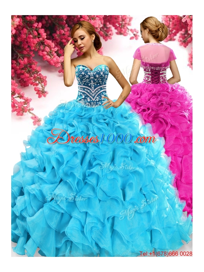 Fashionable Aqua Blue Organza Quinceanera Dress with Beading and Ruffles