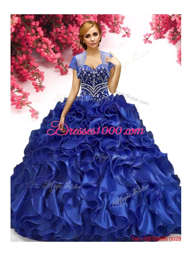 Discount Royal Blue Organza Quinceanera Dress with Beading and Ruffles