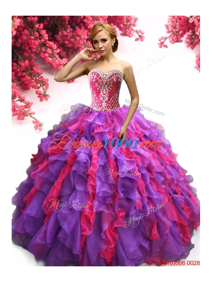 Unique Purple and Hot Pink Quinceanera Dress with Ruffles and Beading
