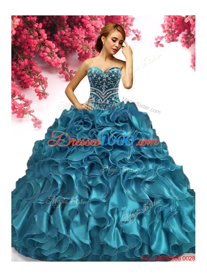 Affordable Teal Organza Quinceanera Dress with Beading and Ruffles