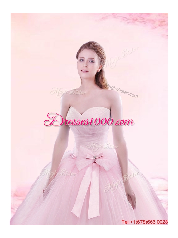 Hot Sale Brush Train Baby Pink Quinceanera Gown with Bowknot and Ruching