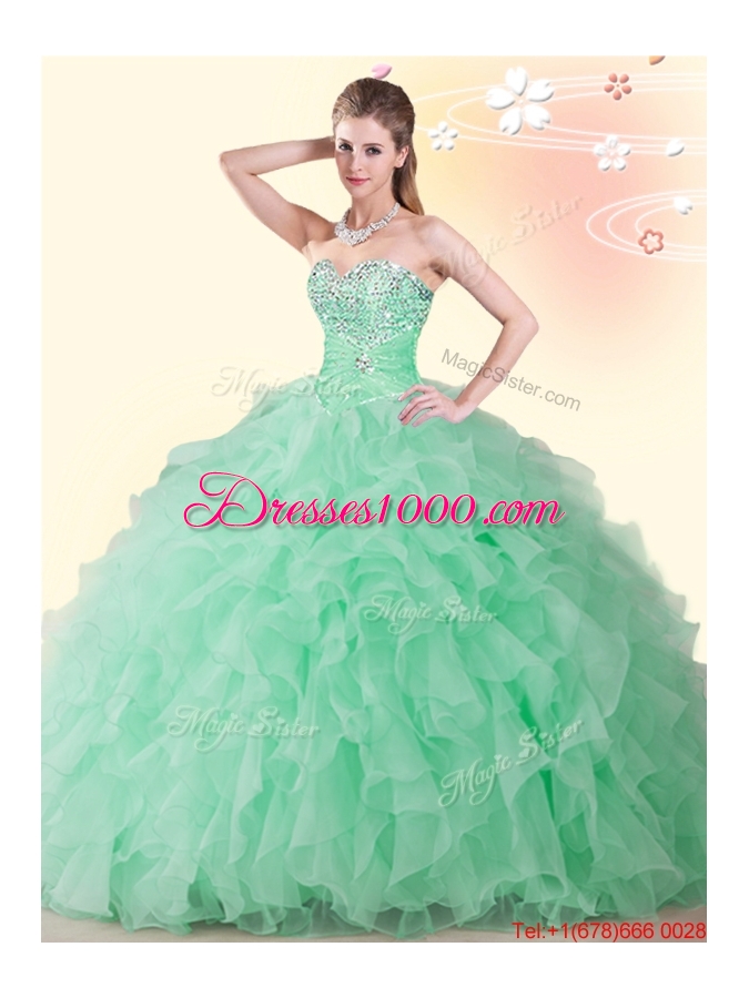 Lovely Really Puffy Beaded and Ruffled Quinceanera Dress in Apple Green