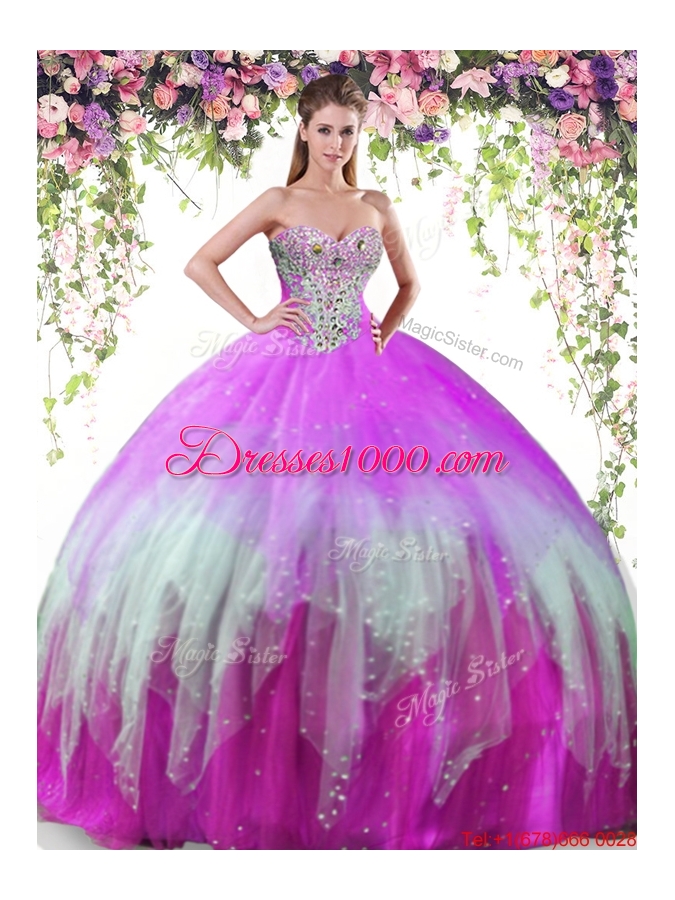 Inexpensive Big Puffy Rainbow Tulle Sweet 16 Dress with Beading