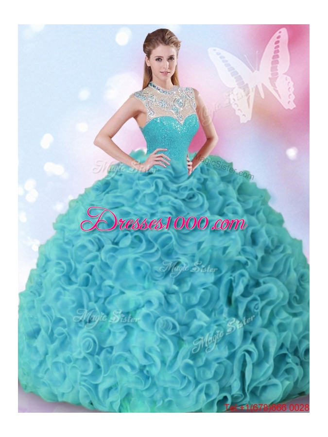 Latest Beaded and Ruffled High Neck Quinceanera Dress in Aquamarine