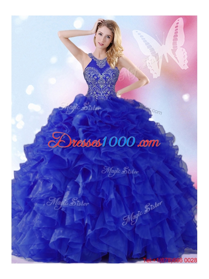 Gorgeous Beaded and Ruffled Royal Blue Quinceanera Dress with Halter Top