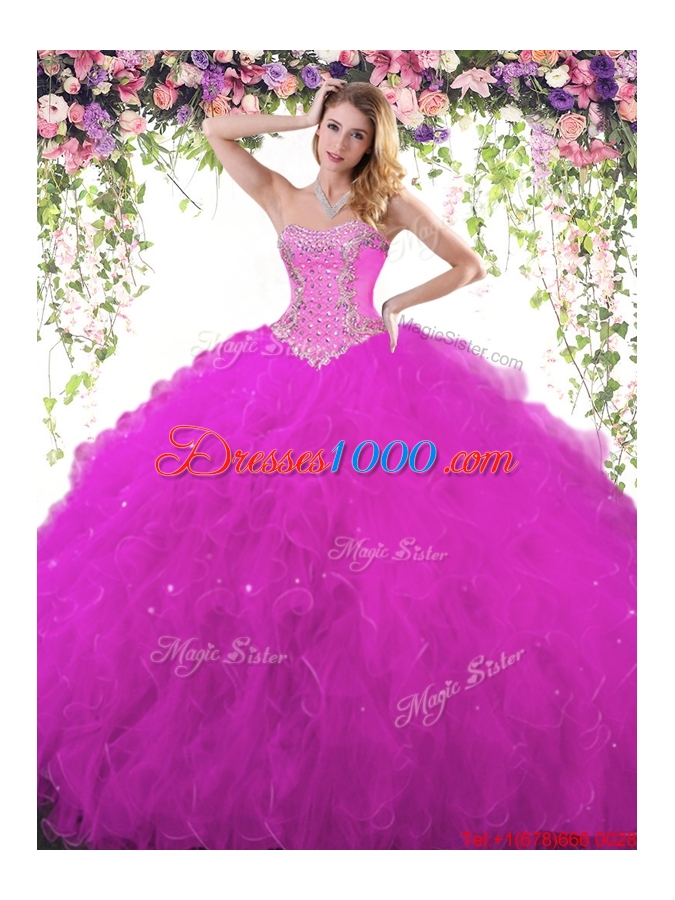 Best Tulle Beaded and Ruffled Quinceanera Gown in Fuchsia