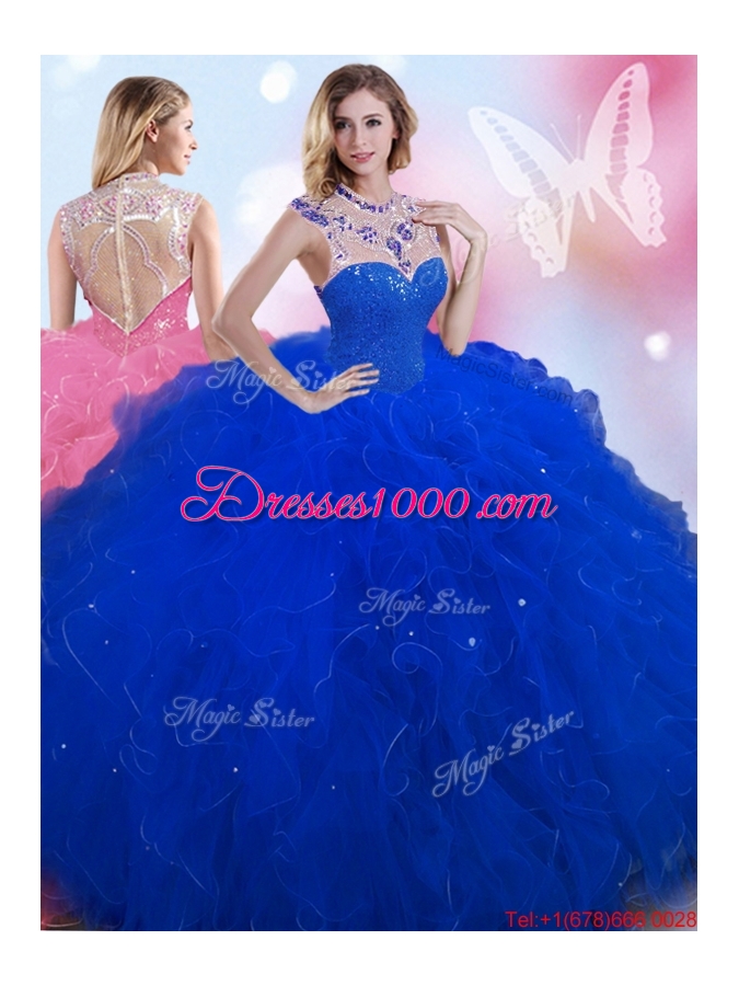 Perfect Beaded and Ruffled Royal Blue Quinceanera Dress with High Neck
