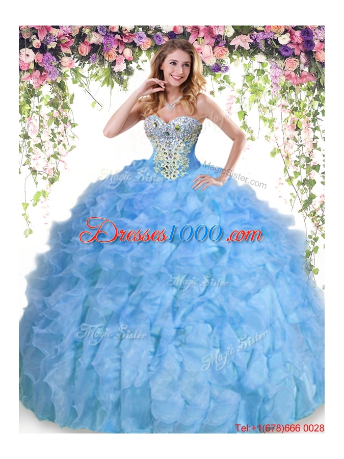 Cheap Organza Beaded and Ruffled Quinceanera Dress in Baby Blue