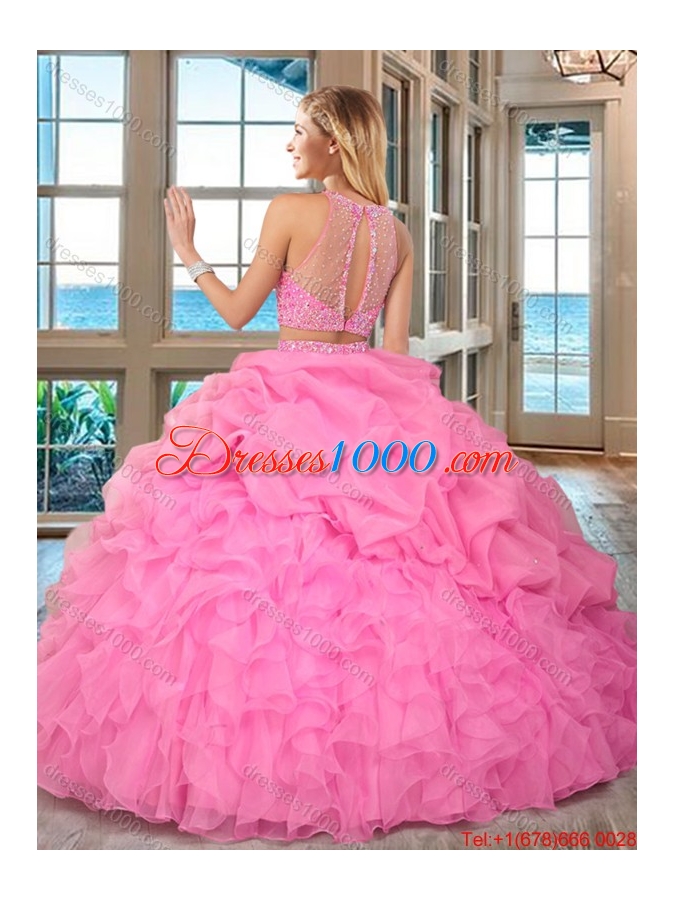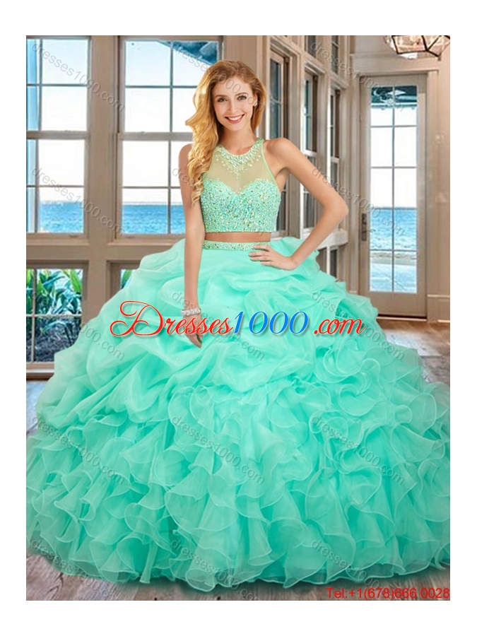 Pretty High Neck Two Piece Open Back Mint Quinceanera Dresses with Beading and Bubbles