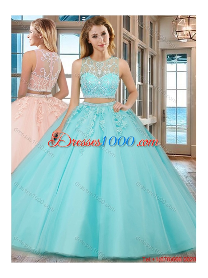 See Through Two Piece Scoop Brush Train Aqua Blue Quinceanera Dresses with Beading and Appliques