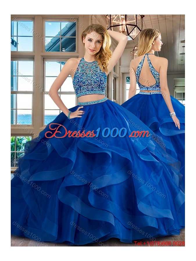 Pretty Beaded and Ruffled Brush Train Quinceanera Dress in Royal Blue
