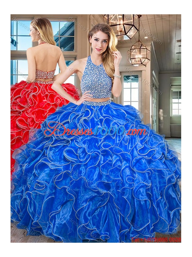 Designer Halter Top Ruffled and Beaded Organza Royal Blue Quinceanera Gown