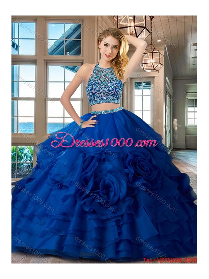 Discount Brush Train Royal Blue Quinceanera Dress with Beading and Ruffles