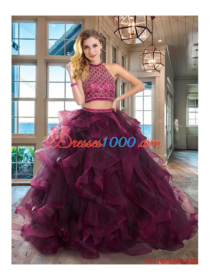 Classical Two Piece Dark Purple Halter Top Ruffled and Beaded Bodice Sweet 16 Dress
