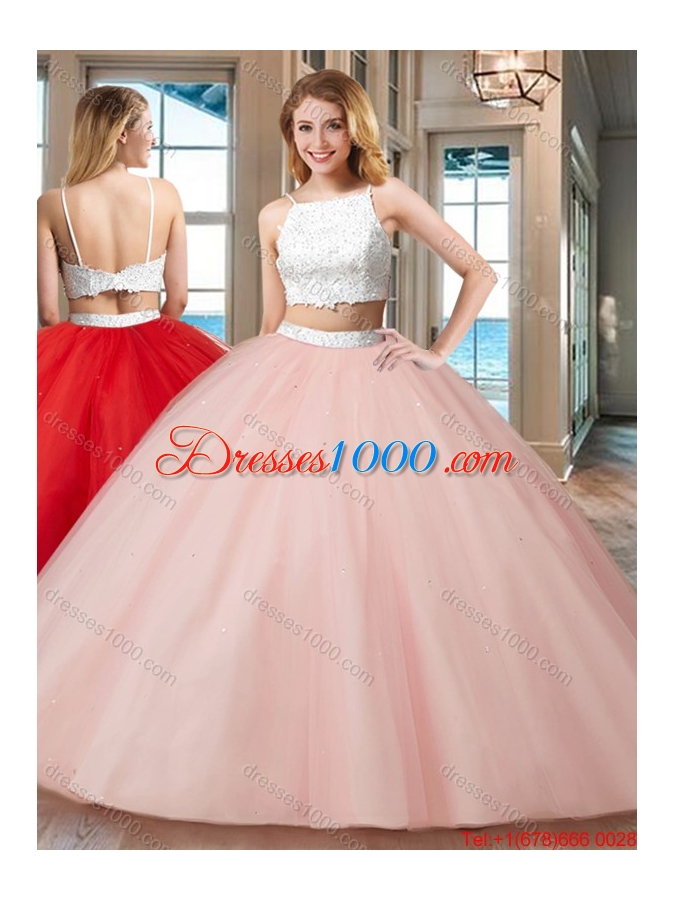 Pretty Ball Gown Straps Tulle Two Piece Backless Quinceanera Dresses White and Pink