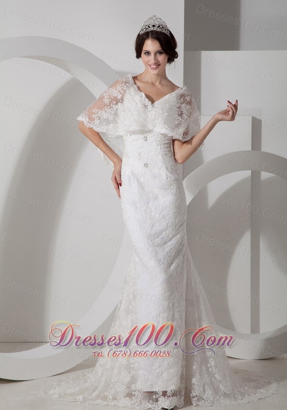 Look enchanting in this timeless lace bridal gown that features a grand lace train. This dress has lace covering the arms, a modest V-neckline and lace through the bust and bodice. And the delicate lace creates a soft look at the hem of this floor-length gown.