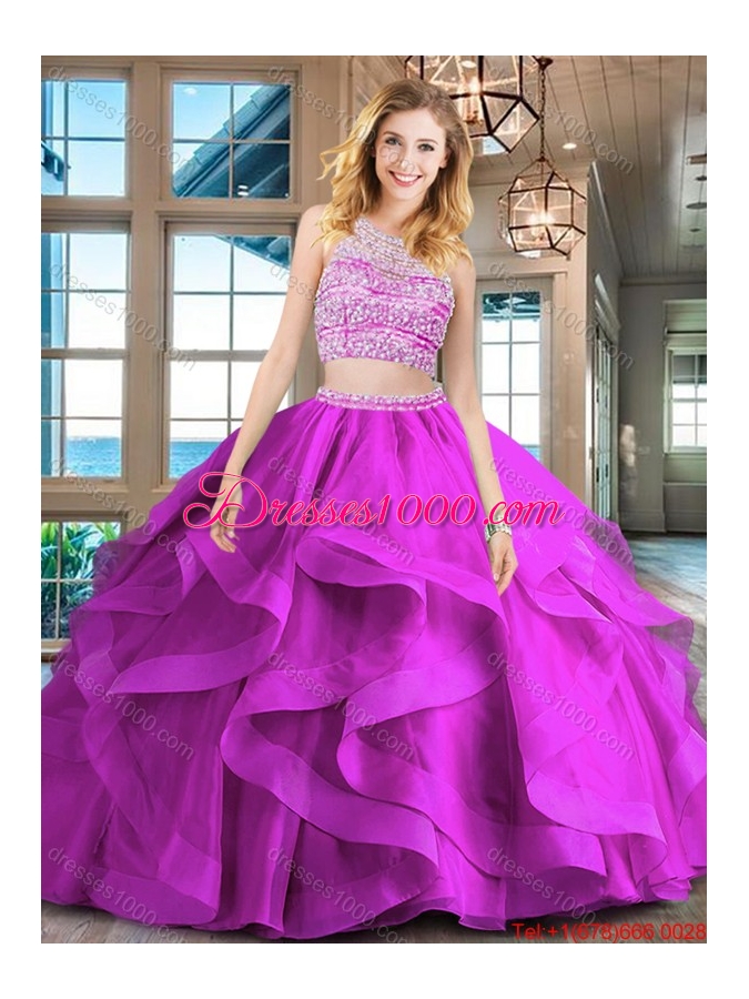 Fashionable Beaded Bodice and Ruffled Brush Train Quinceanera Dress in Fuchsia