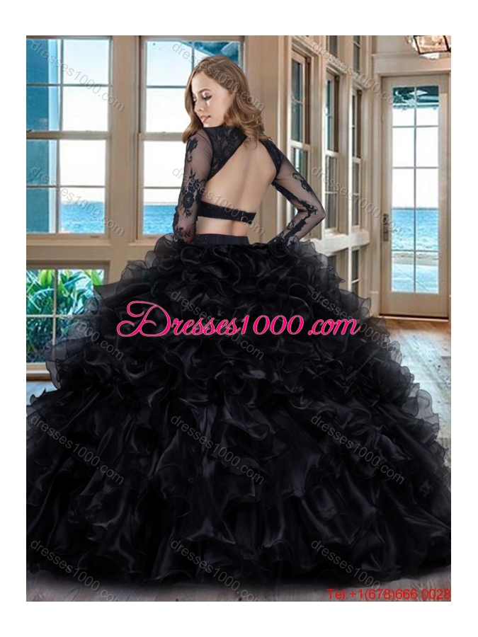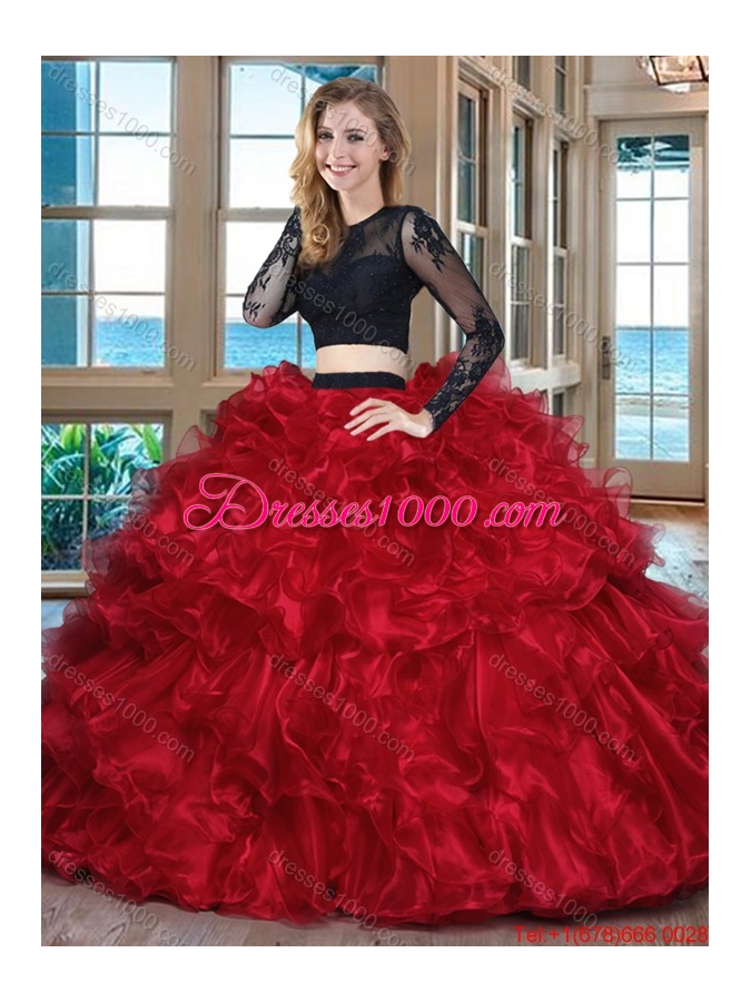 Two Piece Ball Gown Organza Ruffled Backless Red and Black Quinceanera Dresses with Long Sleeves