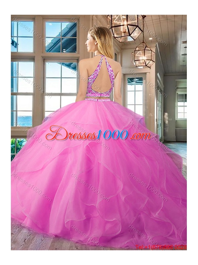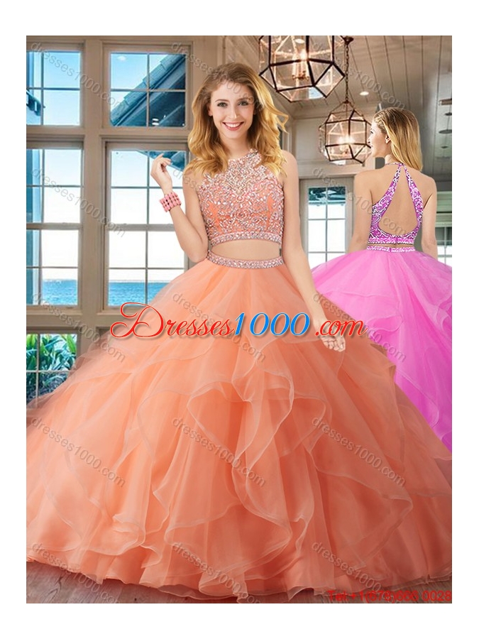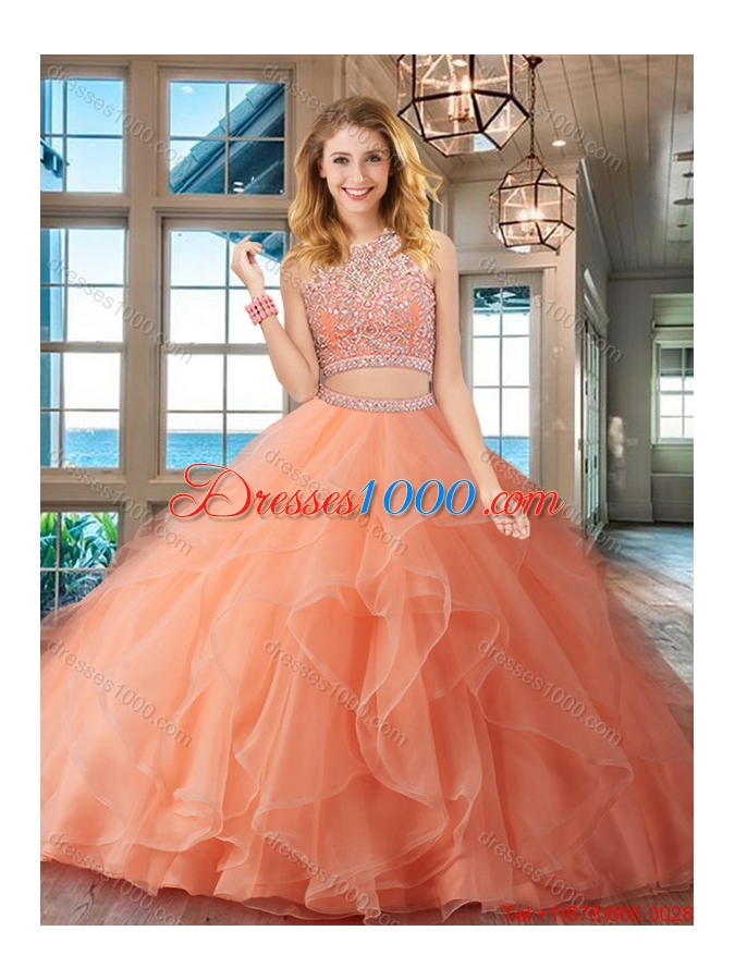 Luxurious Beaded Bodice and Ruffled Peach Quinceanera Dress with Brush Train