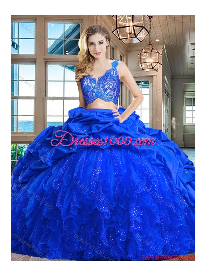 Affordable Tulle and Taffeta Royal Blue Quinceanera Dress with Ruffles and Lace
