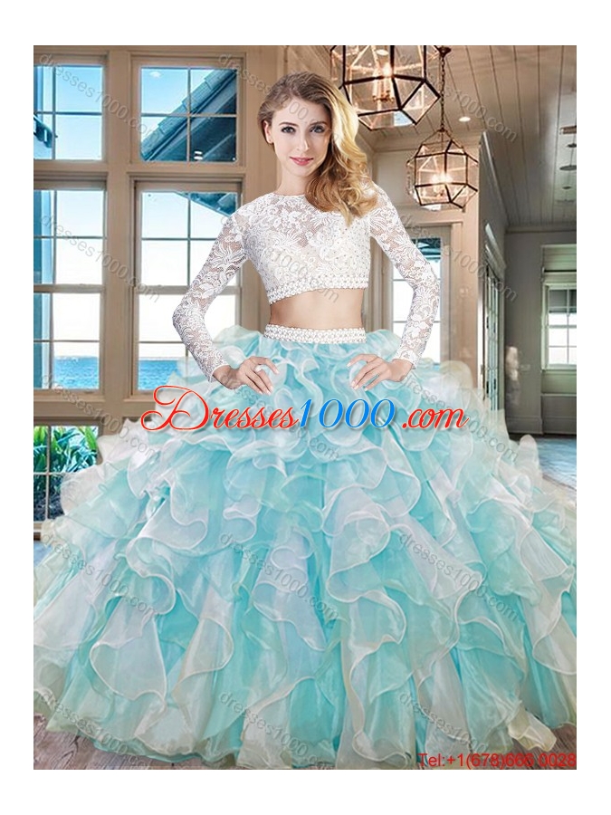 Affordable Organza Laced Ruffled Aquamarine Quinceanera Dress with Long Sleeves