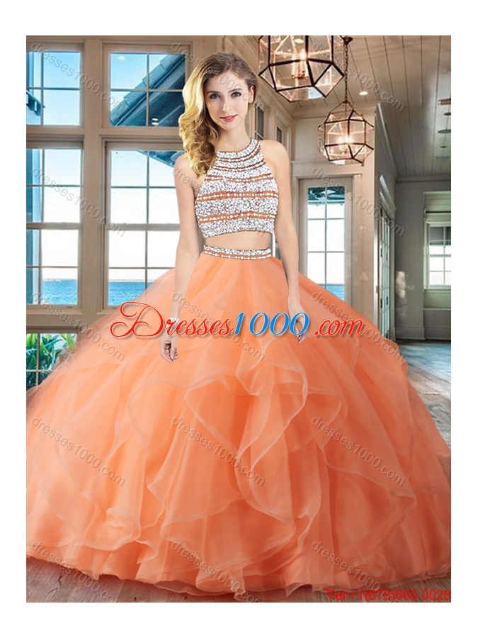Affordable Beaded Bodice and Ruffled Orange Quinceanera Dress with Brush Train