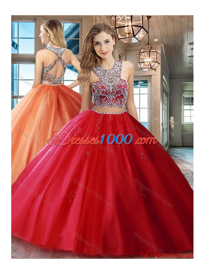 New Style Two Piece Really Puffy Beaded Scoop Red Quinceanera Dress