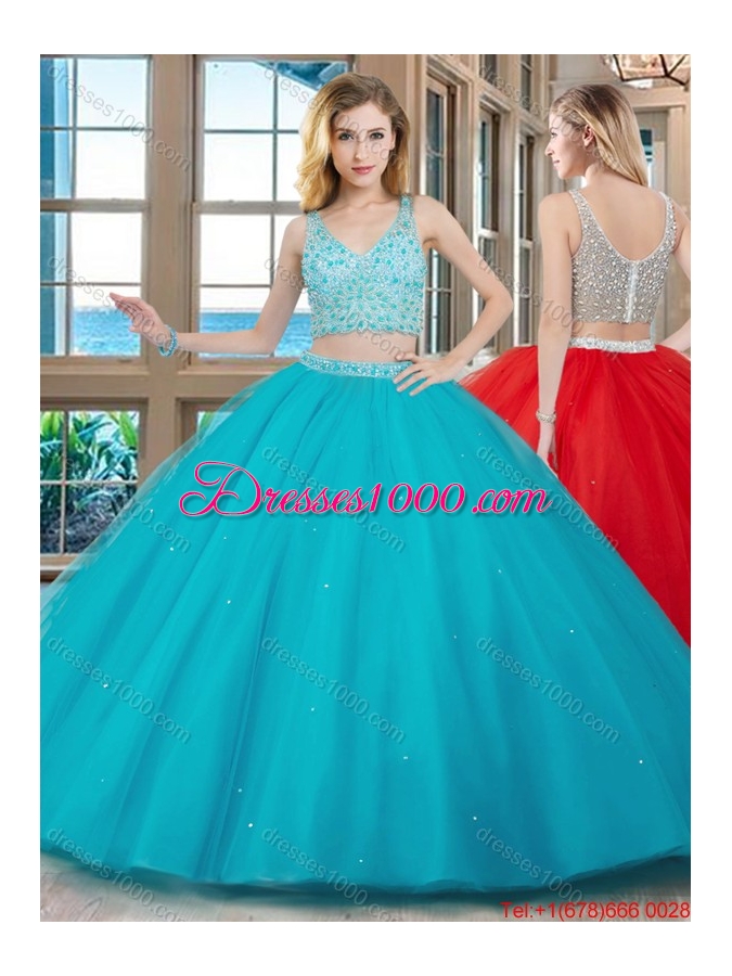 Two Piece Puffy V Neck Tulle Beaded Teal Quinceanera Dresses with Zippper Up