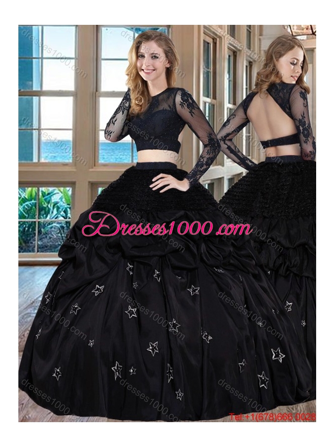 Two Piece Black Puffy Scoop Taffeta Long Sleeves Backless Quinceanera Dresses with Embroidery and Bubbles