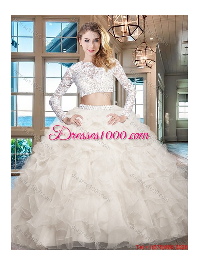Modern Ruffled Long Sleeves White Quinceanera Dress in Organza and Lace