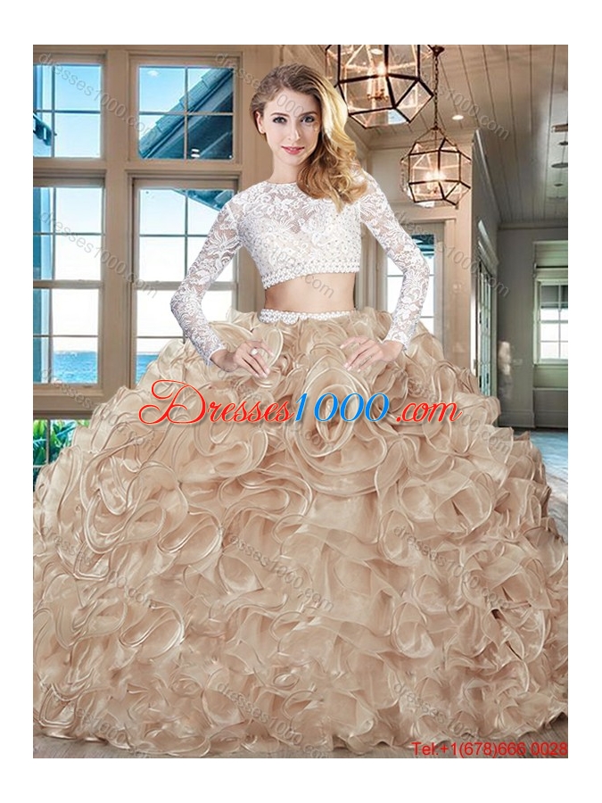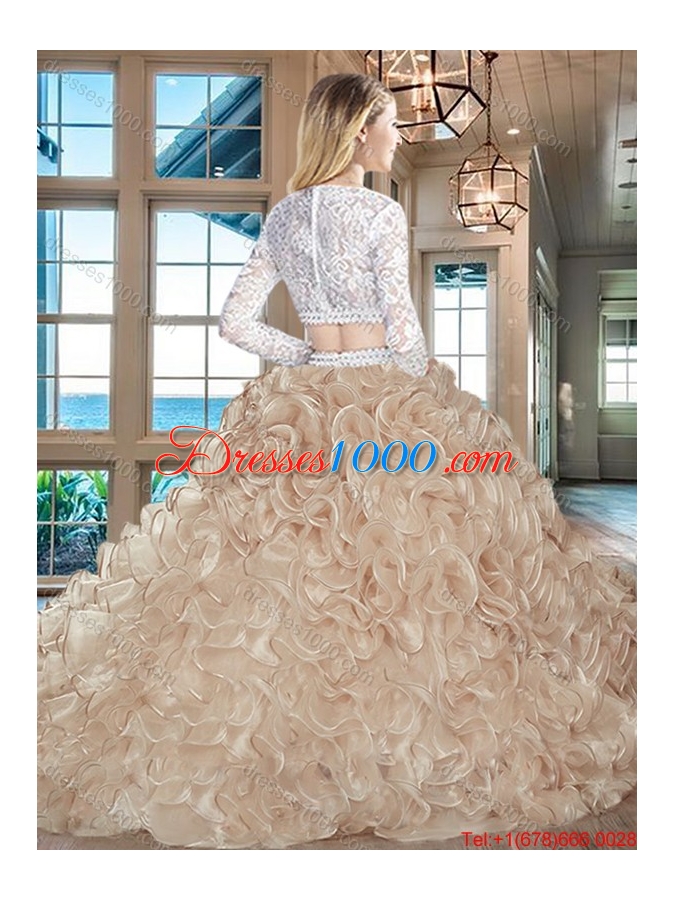 Hot Sale Two Piece Brush Train Laced Organza Sweet 16 Dress in Champagne
