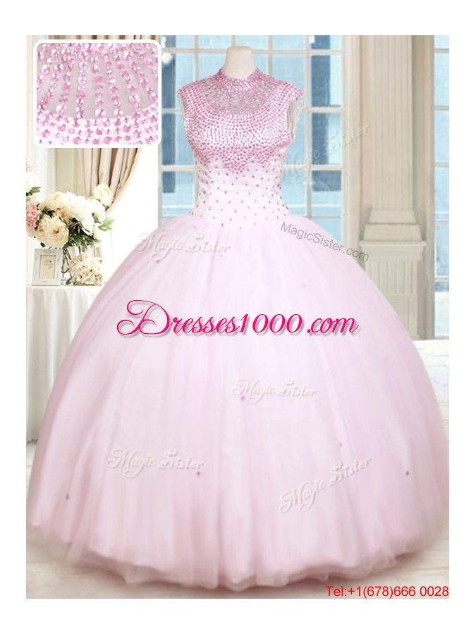 Latest See Through Beaded Decorated High Neck Zipper Up Baby Pink Quinceanera Dress in Tulle