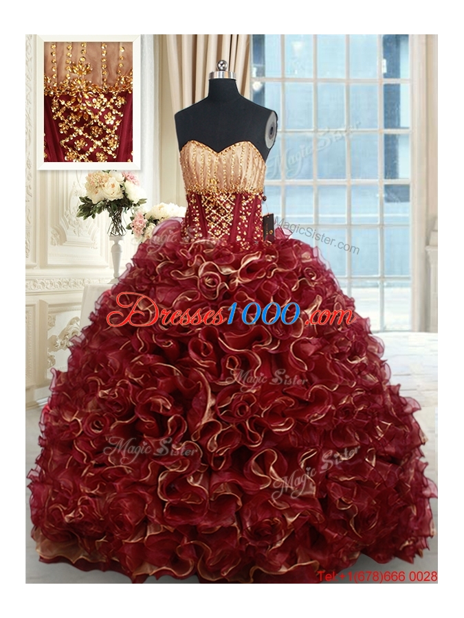 Luxurious Beaded Brush Train Burgundy Quinceanera Dress in Rolling Flowers