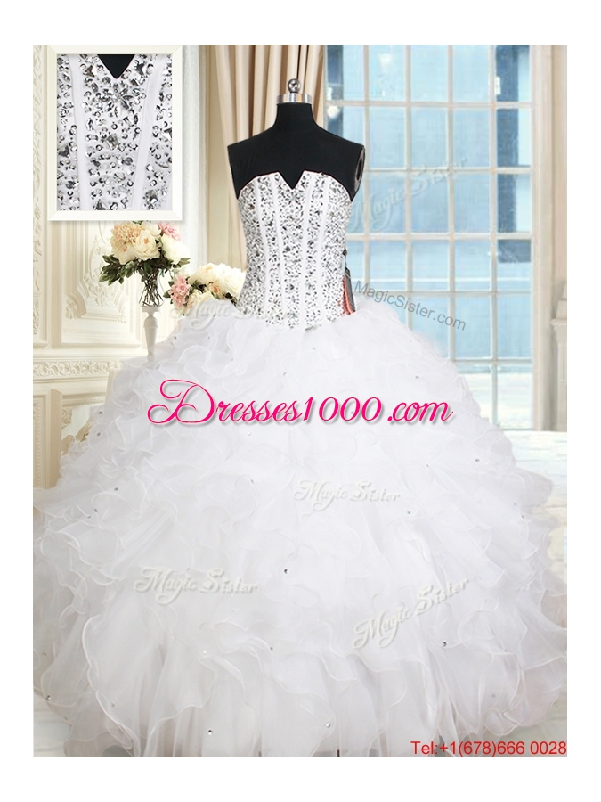 New Arrivals Visible Boning V Neck Beaded Bodice Ruffled White Quinceanera Dress