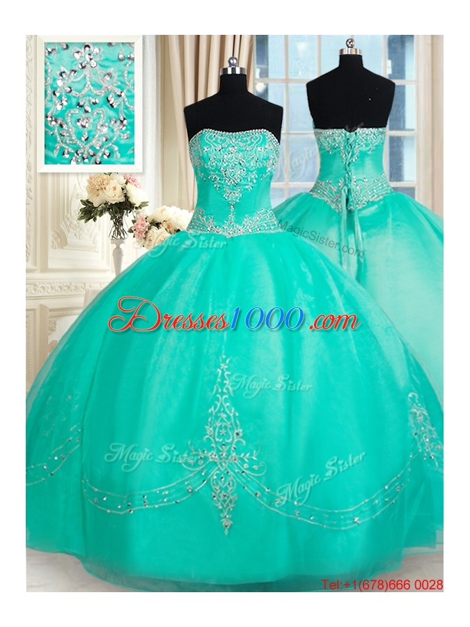Fashionable Strapless Applique and Beaded Organza Quinceanera Dress in Turquoise