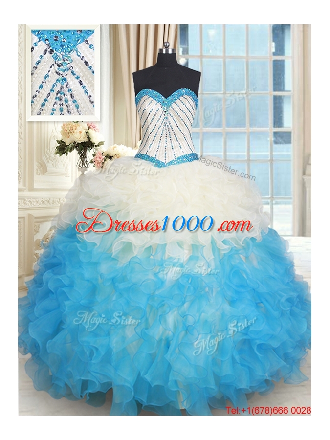 Fashionable Ruffled and Beaded Bodice Quinceanera Dress in Champagne and Blue
