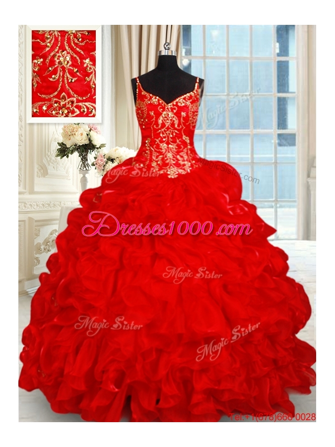Lovely Spaghetti Straps Brush Train Red Quinceanera Dress with Ruffles and Bubbles