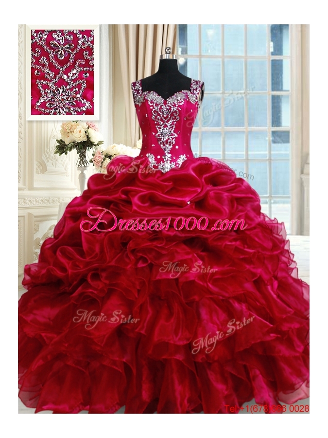 Discount See Through Back Straps Fuchsia Zipper Up Quinceanera Dress with Beading
