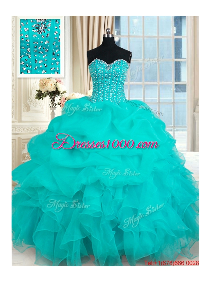 Elegant Visible Boning Beaded Bodice and Ruffled Turquoise Organza Quinceanera Gown
