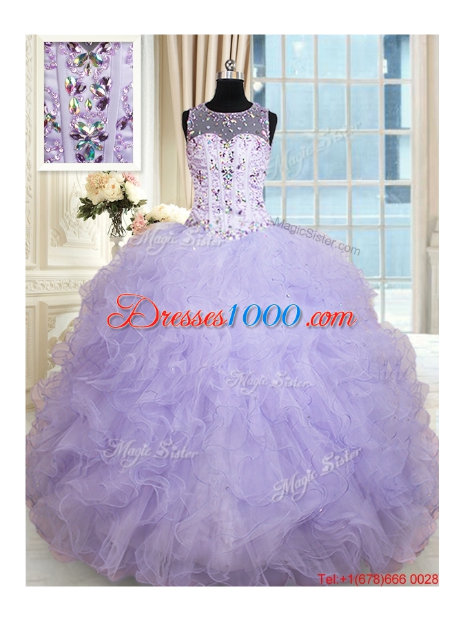 Popular See Through Scoop Ruffled and Beaded Quinceanera Dress in Lavender