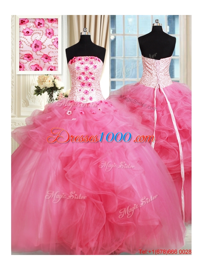 Affordable Beaded Strapless Hot Pink Quinceanera Dress with Appliques and Ruffles